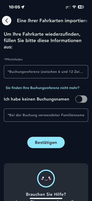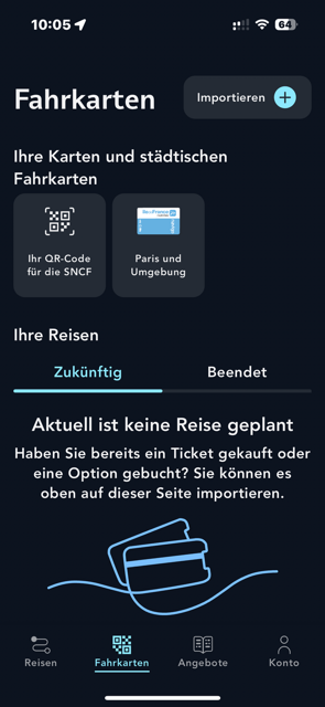 Klicken Sie in der Anwendung auf „Importieren“ oder auf der Website auf „Fahrausweis (Fahrkarte, Karte, Vorreservierung) wiederfinden“.