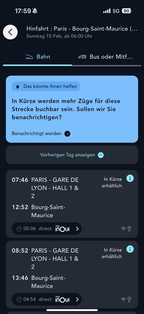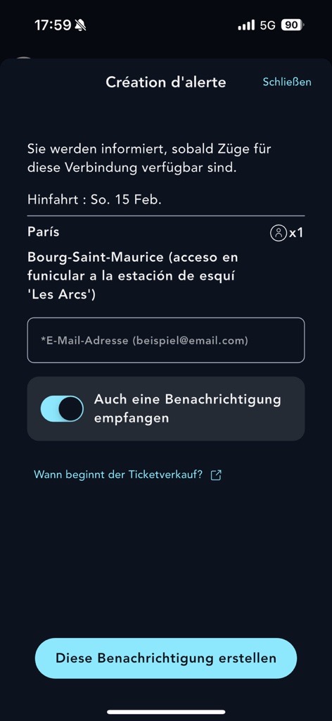 Die Anmeldung für die Benachrichtigung Ticketbuchung wird Ihnen auch bei der Suche nach einer Fahrt angeboten, falls die Züge noch nicht für den Verkauf freigegeben sind.