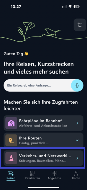 Tippen Sie auf der Startseite der App auf ""Verkehrs- und Streckeninfos""