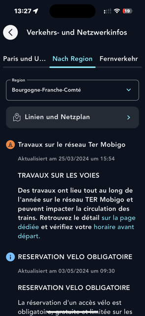 Über die App können Sie sich sogar die Pläne der Verkehrs- und Streckennetze in Paris und Umgebung sowie die Pläne der TER-Züge und der großen TGV-Linien INOUI, INTERCITES, OUIGO... anzeigen lassen und herunterladen.