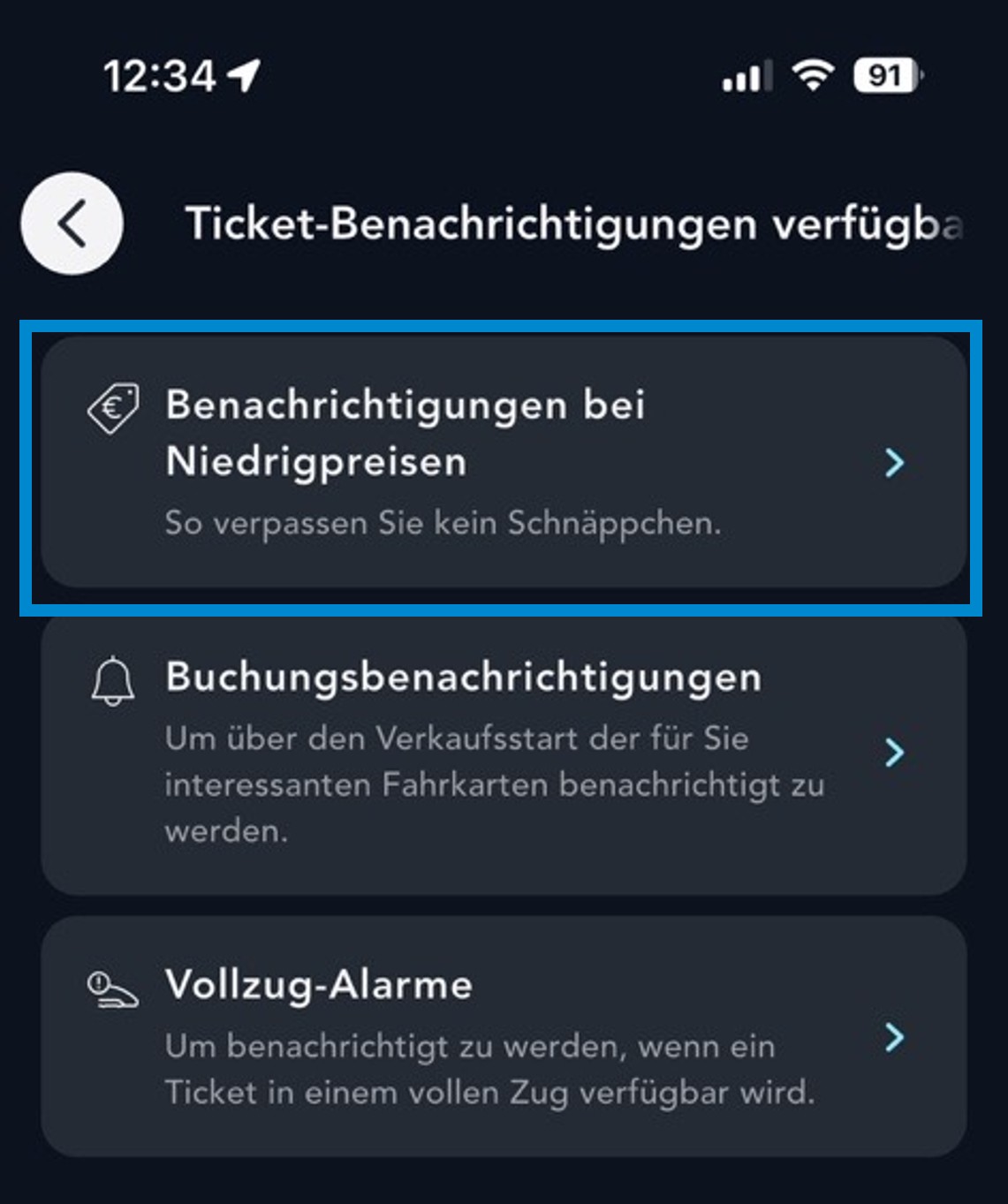 Für Ihre Lieblingsreiseziele können Sie eine Kleine Preise-Benachrichtigung einrichten. Loggen Sie sich dazu in Ihr Konto ein und gehen Sie dann zu „Benachrichtigungen über verfügbare Tickets“. Sobald ein Ticket Ihren Reisewünschen und Ihrem Budget entspricht, werden Sie benachrichtigt.